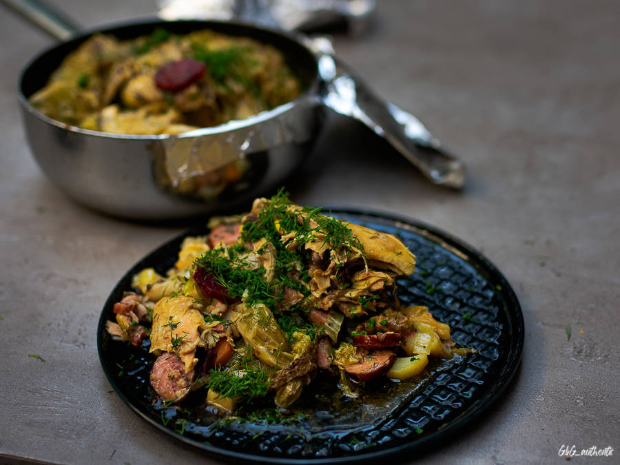 Sposób przygotowania: zaczynamy od pokrojenia głównego bohatera, czyli ziemniaka w plastry o grubości około 0,5 cm. Obsypujemy je odważnie solą i pieprzem oraz dodajemy ziele angielskie i liść laurowy, najlepiej zmielone w młynku do kawy. Marchewki, pietruszkę, buraka i cebulę, poza kapustą, kroimy w plastry lub na cząstki. Kiełbasę proponuję pokroić w plasterki, a boczek w kostkę. Garnek rodzinny, zapewne taki macie, smarujemy smalcem na dnie, nie żałując go, wykładamy na dnie liście kapusty, a na nie pierwszą solidną porcję ziemniaków. Na to kładziemy wędzonkę, kiełbasę, boczek i warzywa. Znowu układamy warstwami ziemniaki, wędzonkę, aż do wyczerpania składników i do momentu, aż zostanie porcja ziemniaków, którą wykładamy. Na wierzch kładziemy pół kurczaka wcześniej sprawionego solą i pieprzem, a także smalec w ilości podobnej do tej, co na dnie, na to liście kapusty i garnek rodzinny przykrywamy pokrywką. Jeżeli tylko będzie pogoda, proponuję ustawić go na ogniu dogaszającego się ogniska, a jeżeli nie mamy takiej możliwości, wstawmy potrawę do kuchennego piekarnika. Pieczemy około 1,5 godziny w temp. 180 C. Po wyjęciu gotowej potrawy proponuję wszystko przemieszać i od razu podawać, koniecznie ze zsiadłym mlekiem. Uczta rodzinna wybitna!