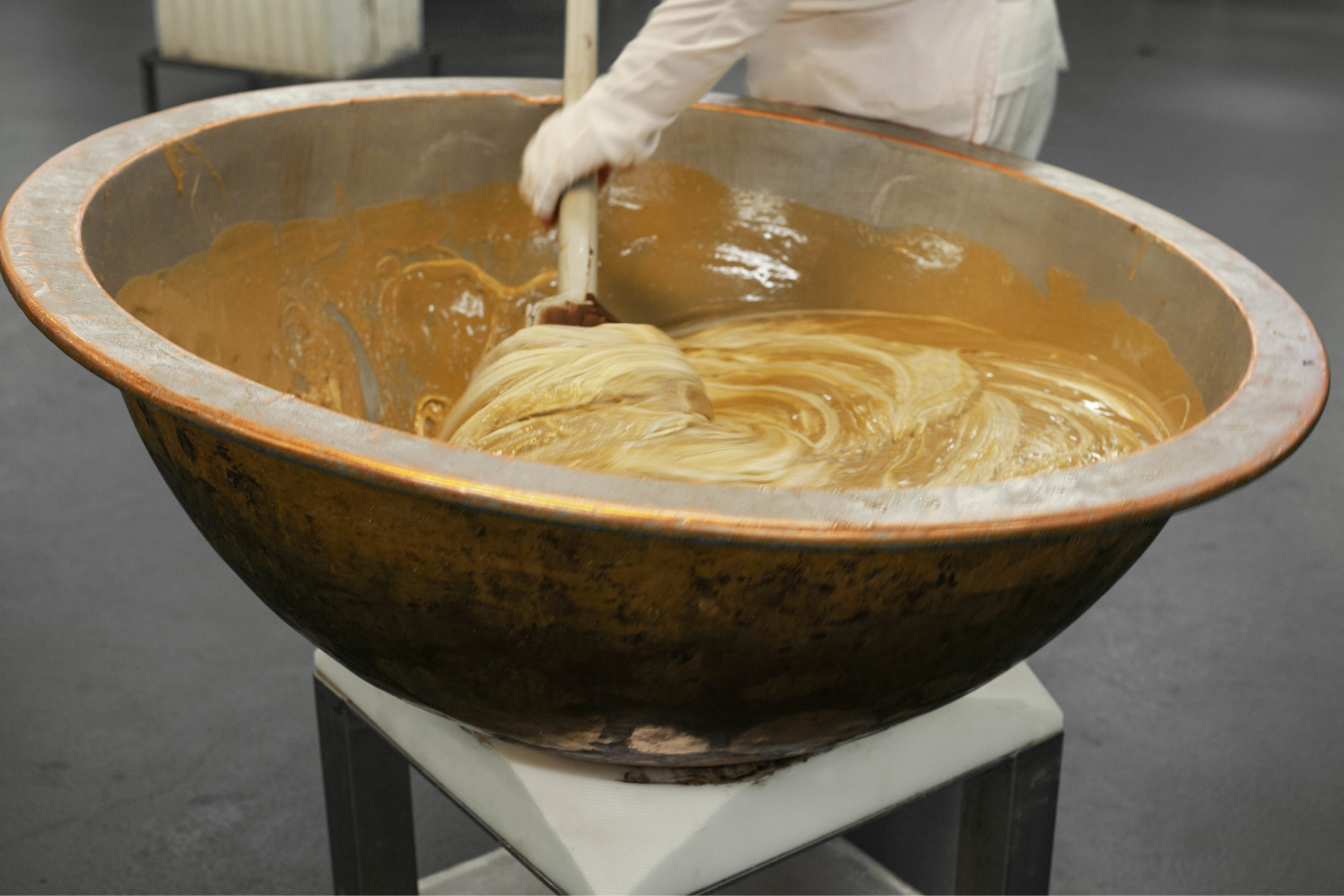 Chałwa wyrabiana ręcznie często ma odpowiednie oznaczenie na opakowaniu – warto zatem zwracać na nie uwagę. A na czym dokładnie ono polega? Masę powstałą z miazgi sezamowej oraz pozostałych składników niezbędnych w produkcji, dosłownie wiosłuje się, czyli miesza za pomocą kopyści przypominającej wiosło, czym w zakładzie produkcyjnym zajmują się doświadczeni specjaliści. To klucz do zachowania właściwej konsystencji finalnego produktu, a proces ręcznego wiosłowania skutkuje powstaniem charakterystycznych dla chałwy włókien karmelu, na których osadzają się drobinki miazgi sezamowej. Można więc rzec, że smak i jakość chałwy w dużej mierze zależą także od ludzi, którzy ją wyrabiają, a w szczególności od ich podejścia oraz doświadczenia.