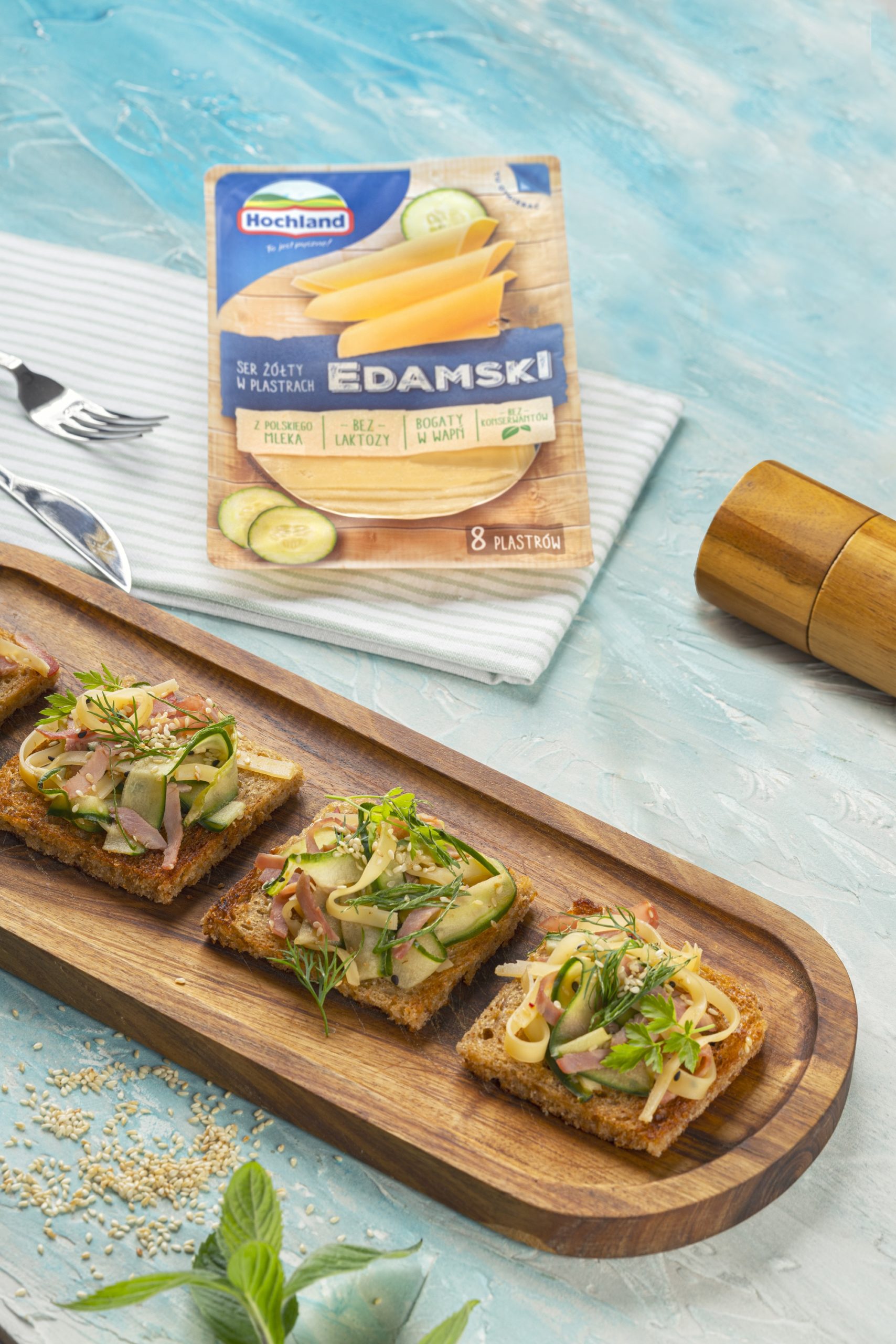 A oto kulinarna inspiracja z Edamskim w roli głównej, czyli pełnoziarniste grzanki z sałatką z szynki, sera i ogórka marynowanego.